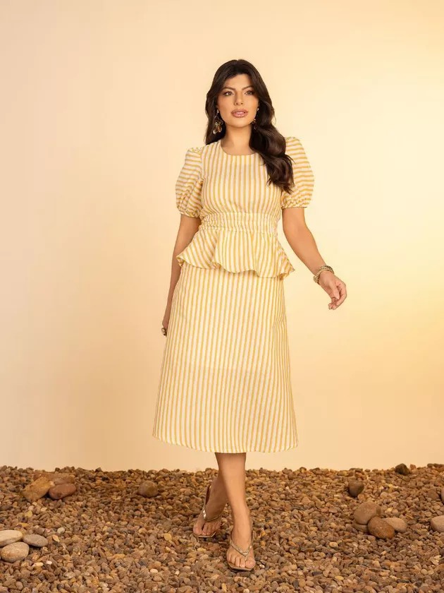 Detalhe: Decote redondo clássico, mangas curtas estilo princesa e padronagem de listras verticais que proporcionam um visual moderno e alongado.