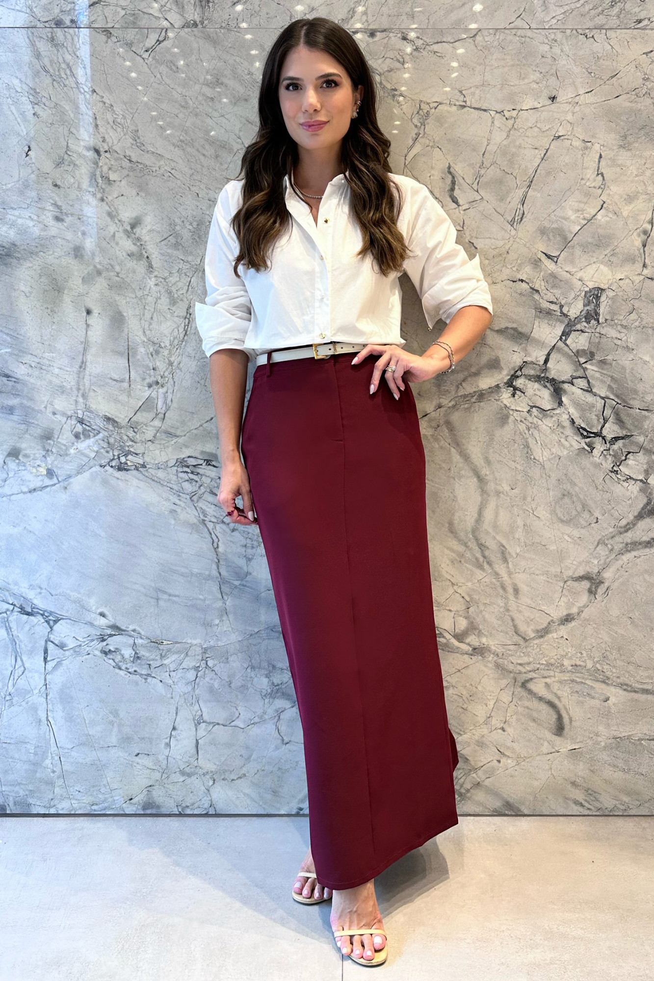 Eleve seu estilo com nossa Saia Longa de Alfaiataria vinho. Com bolsos faca, fenda nas costas, passantes e modelagem reta, esta peça combina elegância e praticidade. Ideal para ocasiões formais ou para um visual casual refinado. O design versátil permite diversas combinações.
