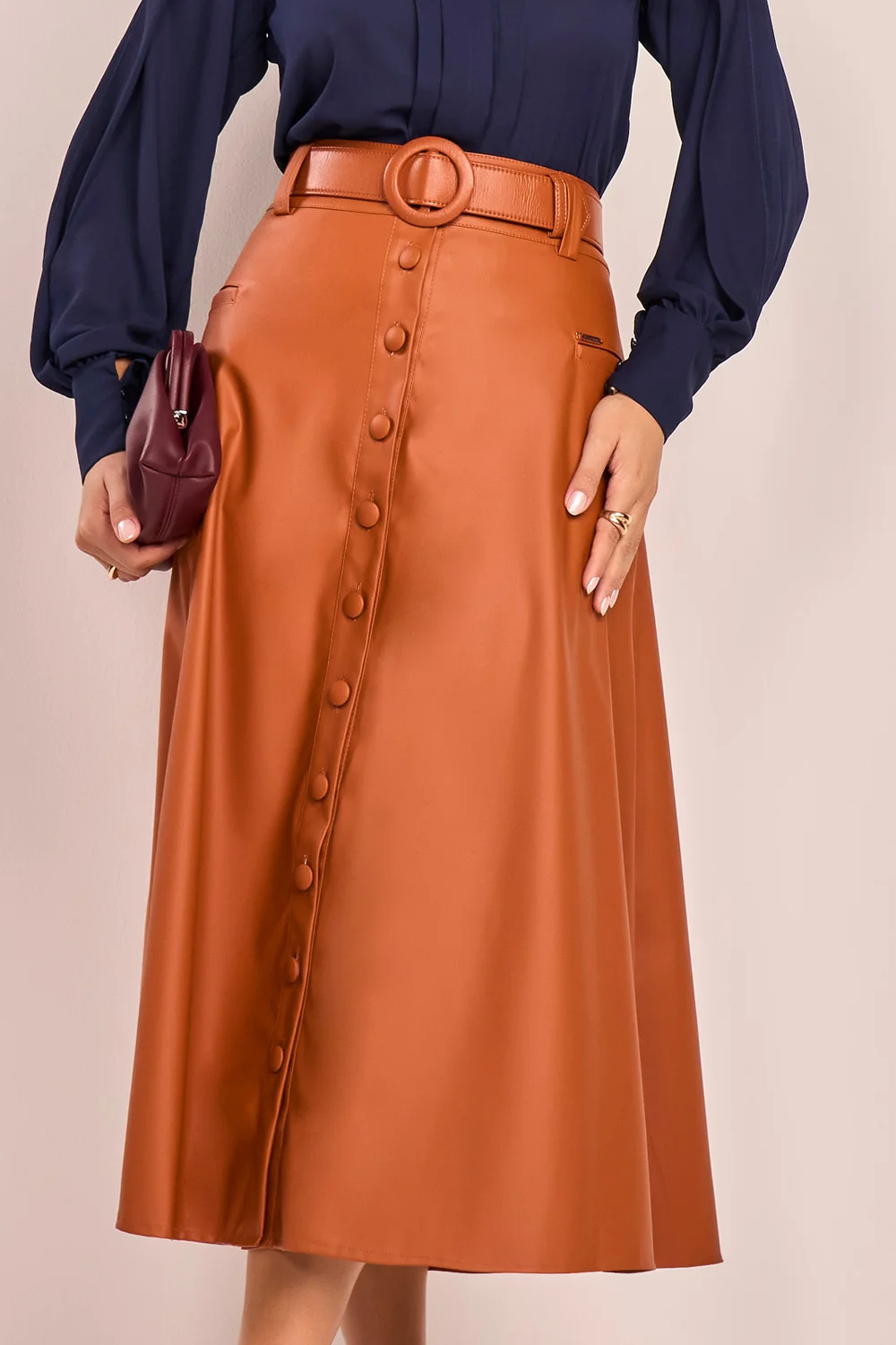 Moderna, marcante e com um toque urbano, essa saia é a escolha perfeita para mulheres que amam unir atitude e elegância. A modelagem evasê traz movimento e leveza, equilibrando o visual estruturado do couro eco. A abertura com botões frontais acrescenta personalidade e praticidade ao vestir. O cinto com fivela redonda complementa com um toque sofisticado e garante cintura marcada com estilo.