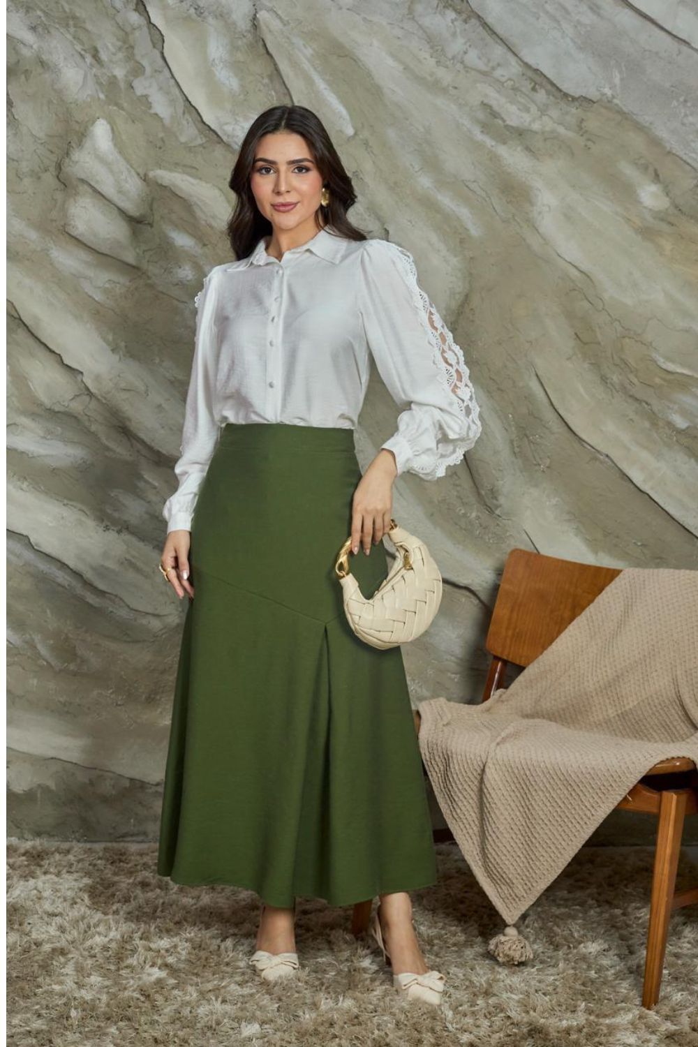 Detalhes: Cós liso e estruturado, passantes para cinto, fechamento em zíper invisível na parte posterior. O tom verde militar traz versatilidade e estilo.