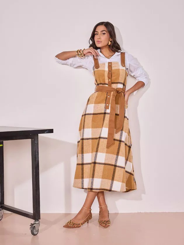 Detalhe: Padronagem em xadrez clássico. Apresenta fechamento frontal decorativo por botões, acompanha faixa do mesmo tecido para amarração na cintura, proporcionando um ajuste personalizado.