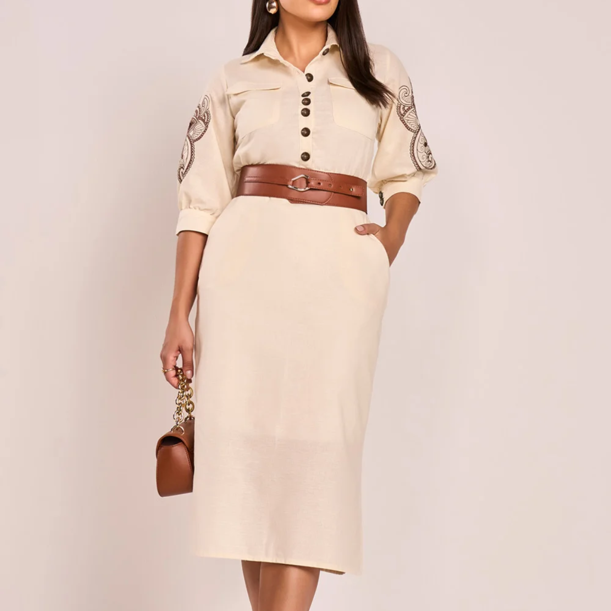 Um chemise midi sofisticado com pegada contemporânea. Este modelo possui mangas com bordados richelieu em composição harmoniosa, bolsos com lapela e fendas laterais que equilibram charme e funcionalidade. Acompanha cinto faixa para marcar a silhueta com elegância.