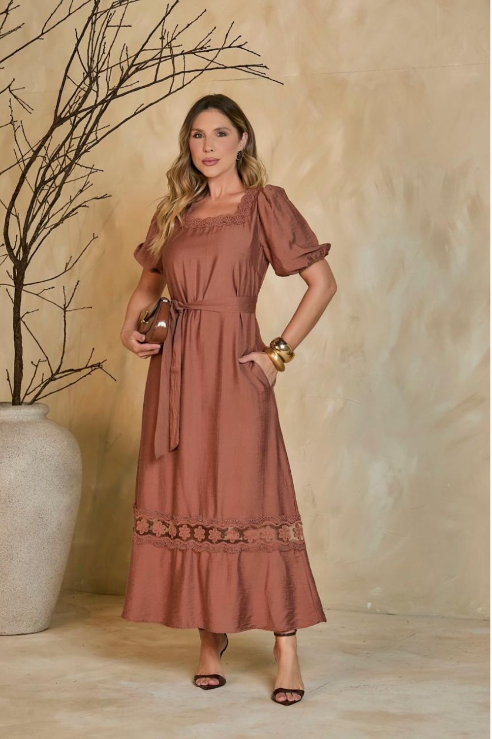 Detalhes: Aplicação de renda guipir/laise em tom sobre tom no decote e na barra. Acompanha cinto faixa no mesmo tecido para amarração. Possui bolsos laterais funcionais embutidos.